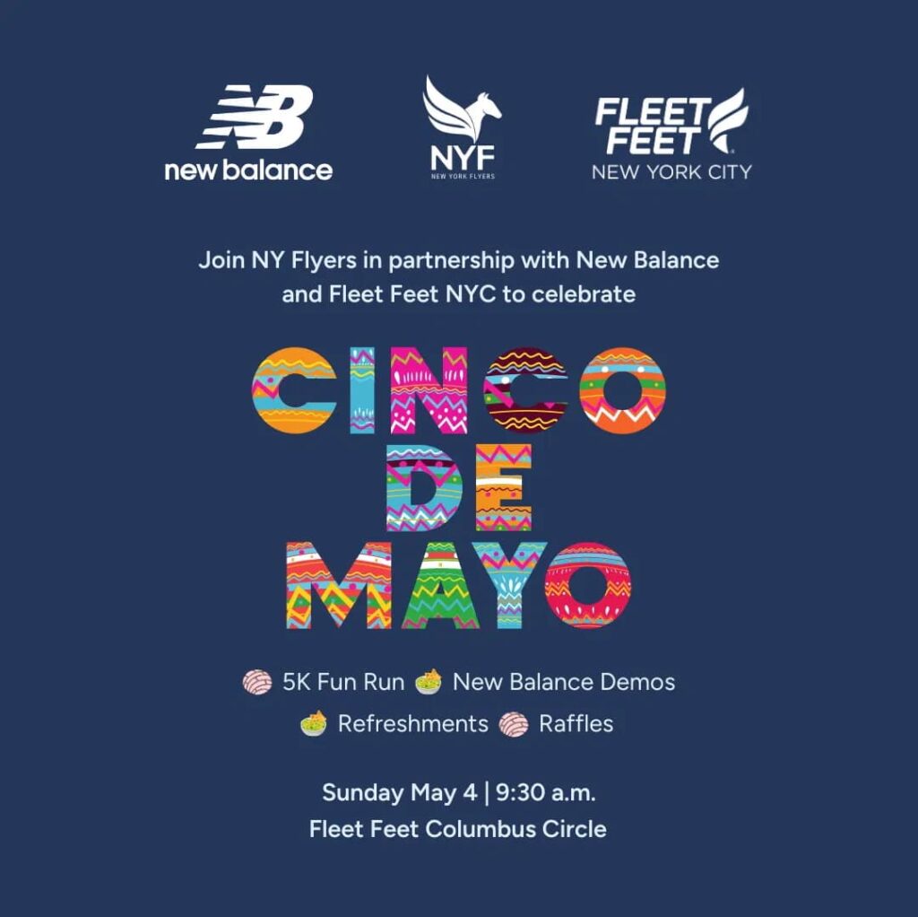 On Sunday we're having a fun 5-mile run followed by food, raffles, and discounts! It’s all part of a free special event the New York Flyers are holding in partnership with Fleet Feet and New Balance on Sunday May 4th, the day before Cinco de Mayo.